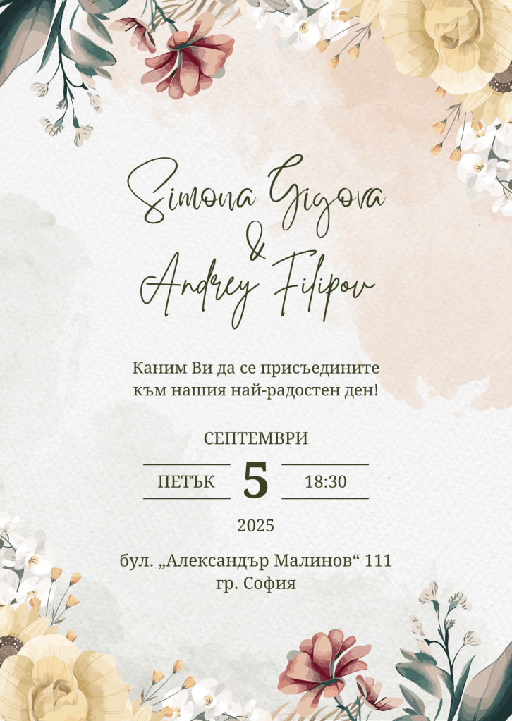 5 септември 2025 — 18:30, Crowne PlazaAleksandar Malinov Boulevard 111, 1766 SofiaОчакваме Ви на този най-радостен ден!